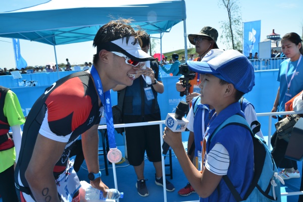 铁人三项赛男子组冠军魏臣在接受新华小记者采访时说:“今天取得冠军,我很高兴,铁人三项赛是一场考验人身体素质和毅力的比赛,也是挑战自我的一个过程,这里风景秀丽,观众热情,给我留下了非常美好的印象。”