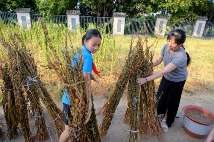 田间地头瞬间变身“劳动实践场”。各班级在班主任带领下分区作业,校长与教师们巡回指导,及时纠正学生们收割时的不规范动作。为激发大家的积极性,活动还设置了“比学赶帮”小竞赛:“质量标兵”比拼收割植株的完整性与掉粒量,“捆扎能手”较量 10-15 株芝麻一捆的捆扎速度与整齐度。孩子们一手握杆、一手下镰,动作从生疏到熟练,田间不时传来“你帮我看看这样割对不对”“咱们捆得再紧点”的交流声。收割完毕后,大家将芝麻捆统一运到脱粒区,根朝下、穗朝上立放,等待后续脱粒,每一个环节都透着认真与专注。