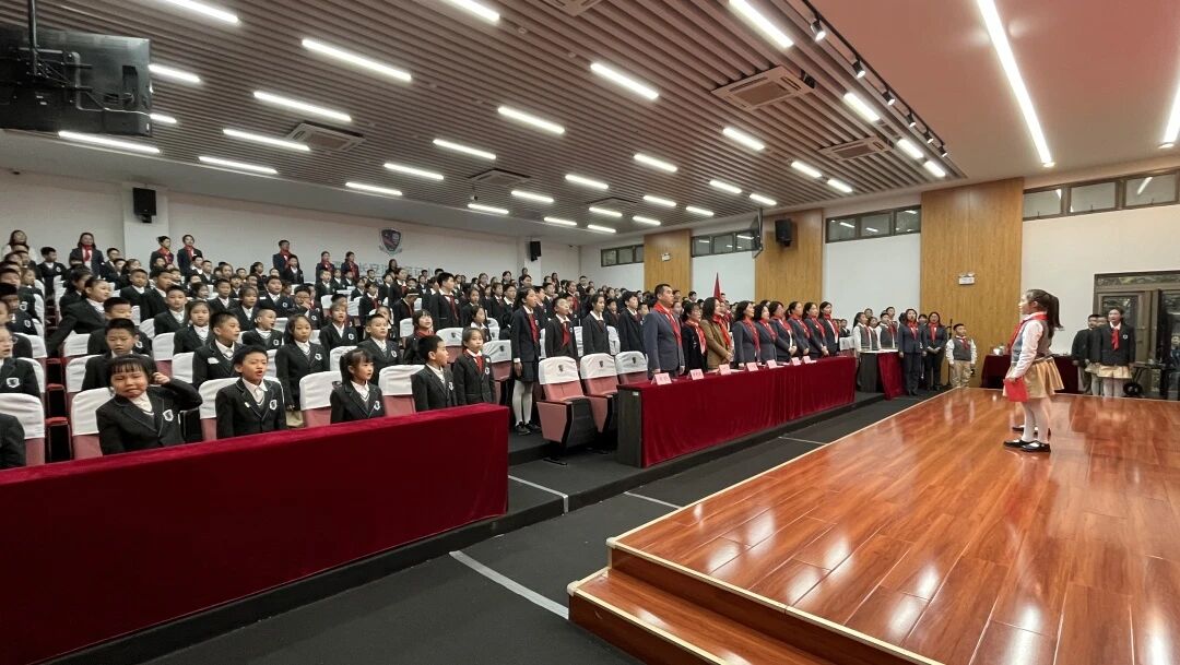 大会伊始,全体起立合唱中华人民共和国国歌。伴随着庄严的出旗曲,护旗手们迈着铿锵有力的步伐进入会场。全体少先队员高唱《中国少年先锋队队歌》,激情澎湃的歌声久久回荡,唱出了队员们心中崇高的理想。