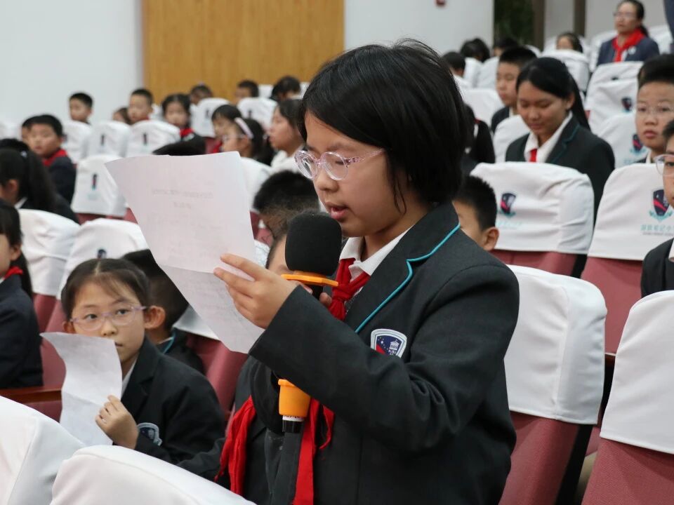 少先队大队长郭子易宣读倡议书,向全体队员发出倡议,要做“勤学善思”的追光者,做“担当有为”的小先锋,做“向阳向上”的好少年。队员们,少代会是新的起点,让我们携手并肩,以梦为马,不负韶华,用实际行动为少先队增光添彩!