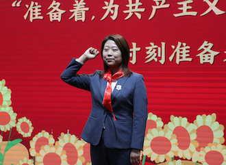大队辅导员宋玥老师带着在场全体新老队员们呼号:为共产主义事业而奋斗,时刻准备着!响亮的回答表示他们决心。