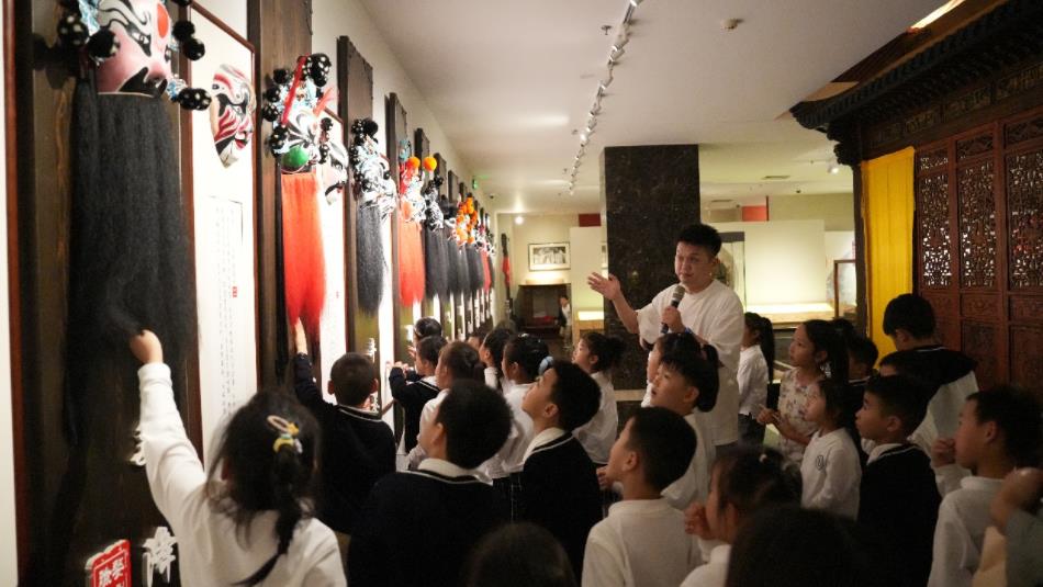 第三站,同学们走进了中国婺剧院婺剧博物馆。一场别开生面的“婺剧小课堂”在这里开讲。专业老师以生动有趣的方式,将婺剧五百多年的历史长卷缓缓铺展在我们面前。从婺剧角色行当的分类,到高亢激昂的独特唱腔,再到色彩斑斓、寓意丰富的精美脸谱——老师娓娓道来,引人入胜。小朋友们听得目不转睛,不时发出惊叹,尤其当亲眼看到清末时期的华丽戏服、各式各样的道具兵器时,一张张小脸上写满兴奋与好奇,跃跃欲试的神情仿佛也想要登台体验一番。这一刻,我们不仅全方位领略了金华人自己的戏曲瑰宝,更真切感受到身为婺剧传承地的自豪。五百年的音韵流转,非遗的魅力震撼心灵,而那流淌在金华血脉中的文化基因,也悄然浸润进每个孩子的心田。