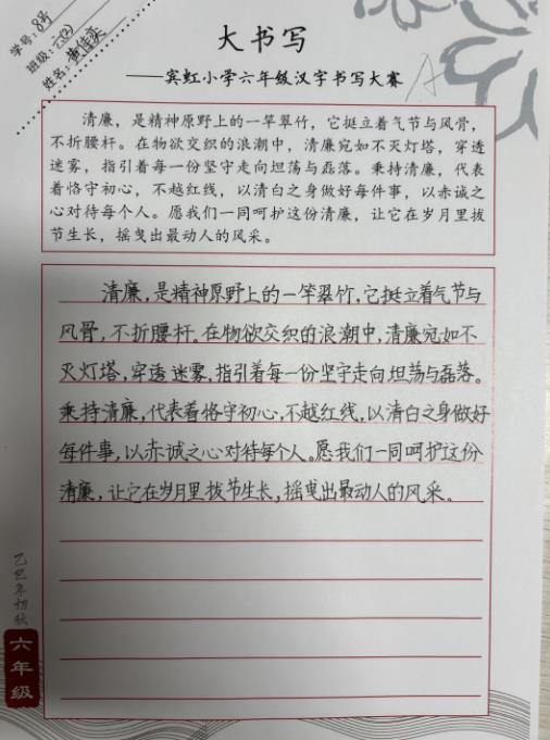 本次大书写比赛培养了中小学生规范、端正、整洁的书写习惯,弘扬了中华民族的优秀文化,提升了学生的书写素养和文化认同感,形成素质教育的长效机制,为学生全面发展奠定了坚实基础。