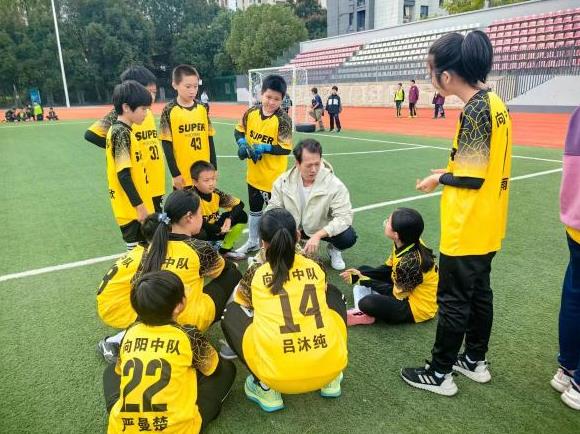 场边的热烈气氛与场上角逐交相辉映。教练和老师们全程投入,时而蹲在场边提示跑位,时而为精彩攻防振臂高呼;各班啦啦队创意十足,必胜头巾与自制加油板交织成流动的风景;每当比赛陷入胶着,“加油”声浪便从四面看台涌向球场。在低年级赛场边,指导声与助威声往往比场上争夺更加热烈——教练俯身比划着战术,班主任带着孩子们齐声呐喊,家长记录着每个拼搏瞬间,所有人用最质朴而饱满的热情,共同构成了这场足球盛宴的完整图景。