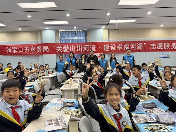 “科学实验DIY手动抽水机”环节将活动推向高潮。同学们在志愿者指导下,专注组装零件,体验科学魅力。莘瑞宝副局长与张红梅校长也加入其中,与师生协作完成实验。当抽水机成功运转,现场响起阵阵欢呼,每一滴水的珍贵被深深铭记。