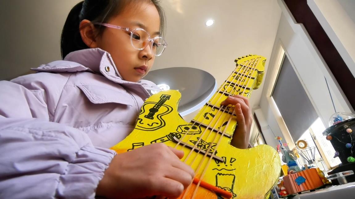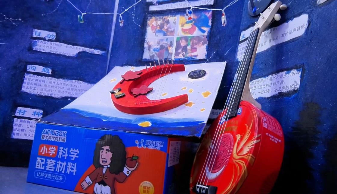 四年级的孩子们化身小小乐器工匠,将科学探索与艺术创造、环保理念巧妙融合。他们巧用冰棒棍、纸箱、塑料瓶、月饼盒、玻璃瓶等废旧材料,亲手打造出弦乐、敲击等各类创意乐器——有绘着童趣图案的冰棒棍手风琴,有乐高元素装饰的纸板吉他,有梦幻的月亮造型竖琴,还有用玻璃瓶制作的彩色编钟、融入国风的月饼盒班卓琴,以及绘着海洋元素的黏土古筝……从选材构思到动手制作,孩子们在实践中发现问题,通过探究寻找解决方案,不断测试改进每一件作品。