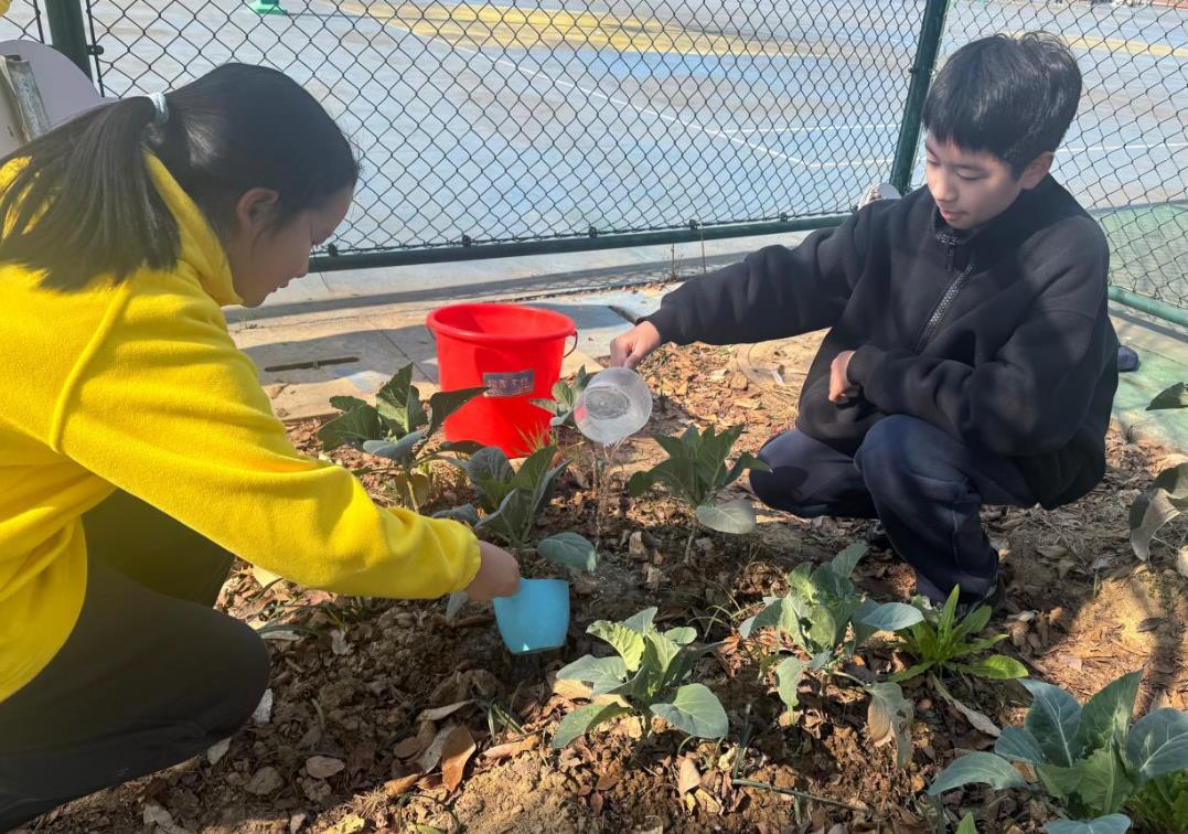 这些青菜是702班的同学们亲自栽种的。9月份,同学们响应学校劳动教育的号召,认领了学校一畦菜园,同学们亲切地称呼它为“半亩园”。同学们在小小的“半亩园”里松土,播种,浇水,施肥,并自发排好值日表,轮流提着水壶为秧苗浇水,细心观察每一片新叶的生长。周末,家长也会带着孩子专程返校,提着准备好的有机肥,手把手教孩子们如何均匀施肥。