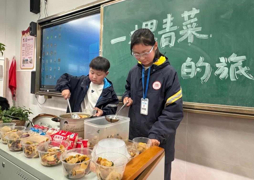 “这青菜也太甜了吧!”“这是我吃过最好吃的青菜炒年糕!”“明年我们种什么呢?”浙江省金华市南苑初级中学702班的教室里,传出阵阵讨论声。走近教室,原来是他们正在品尝自己亲手种的青菜。你看,同学们的碗里盛满了青菜炒年糕,他们一个个吃得津津有味,青菜的清香混合着年糕的软糯、香肠的咸香,弥漫在702教室。