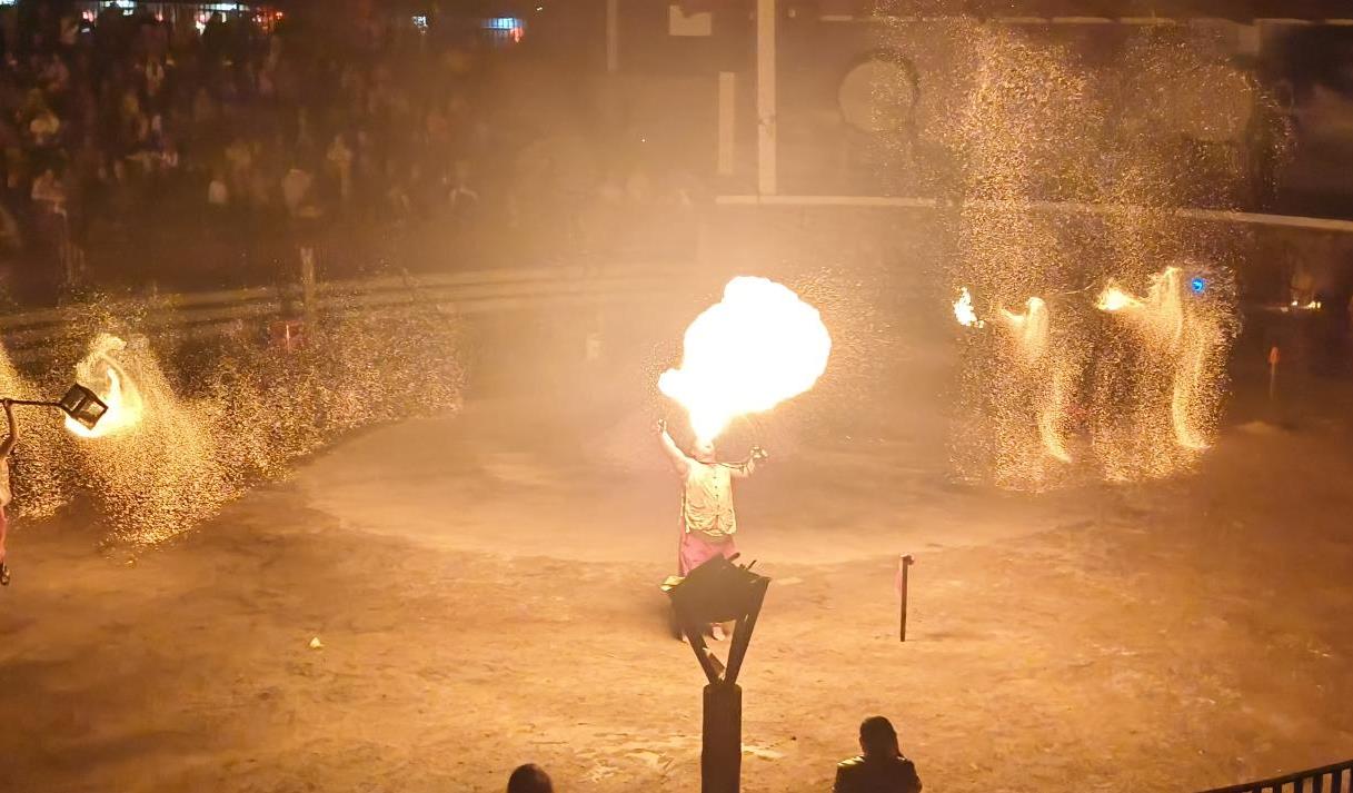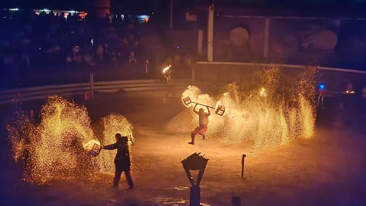 夜幕降临,不一会儿,观众席上A、B、C、D四个区便坐满了来自四面八方的游客。晚上七点多,大约100框炭火准备就绪,主持人介绍说,火红的炭火预示着新的一年红红火火。炼火表演开始时我惊讶地发现,台下突然来了个穿着喜庆花棉袄的机器人,远远望去,和春晚上台表演的机器人很像:蓝色灯光脑袋,个头比勇士们稍微矮一点,四肢灵活有力,跟着勇士们围绕着火坛向四方位祈福,举行开水火门仪式,还时不时向我们招招手,现场氛围顿时就嗨了。