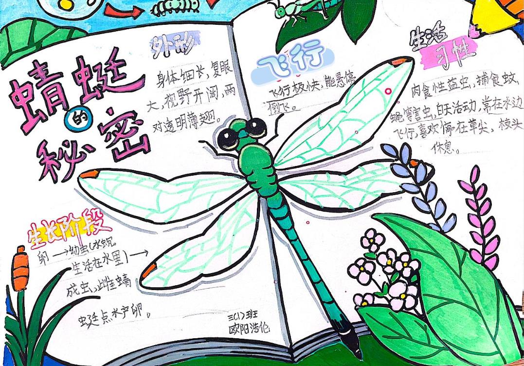 孩子们的创意更是藏不住——剪纸拼贴的“蜻蜓点水图”栩栩如生,翅膀的纹路用彩纸层层叠加,仿佛下一秒就要掠过水面;流程清晰的“蚕的一生”笔记,用简笔画一步步还原从蚕卵到飞蛾的蜕变,每一个阶段都标注着关键特点;还有精细勾勒的“螳螂结构图”,头部的复眼、前肢的锯齿都清晰可见,连触角的数量都标注得一丝不苟。一份份笔记虽带着孩童的稚嫩,却每一页都闪耀着认真思考的光芒,藏着对自然的敬畏与热爱。