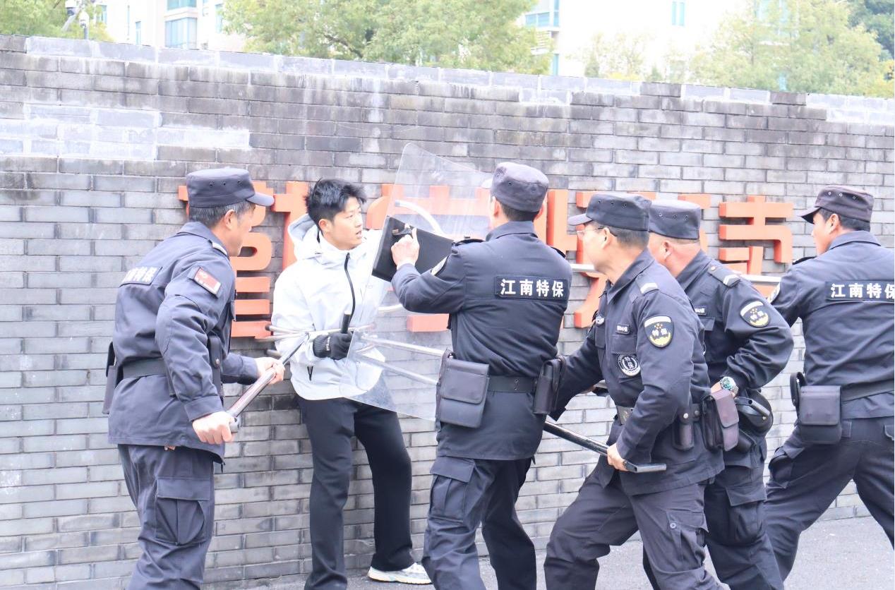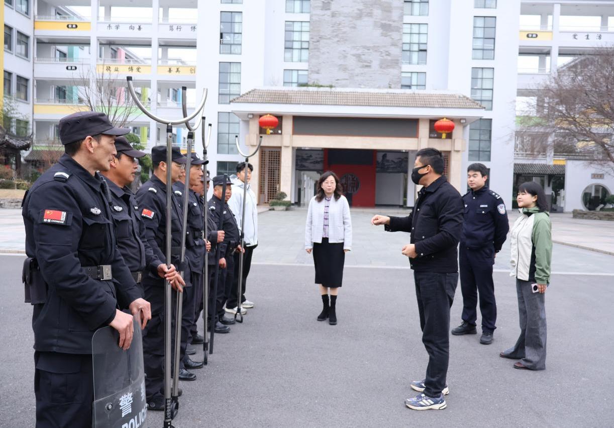 演练前,校领导联合保安公司教官制定详细预案,明确各岗位职责,讲解演练流程与处置要点;演练中,模拟不明身份人员企图强行闯入校园的突发场景,校门口安保人员第一时间发现险情,迅速按下一键式报警器报警,同步上报校领导,手持防暴钢叉、盾牌等器械上前拦截管控。学校应急小组与安保人员紧密配合,形成联防联控处置体系,整个演练过程紧张有序、衔接顺畅,精准还原了校园突发险情的真实处置流程。