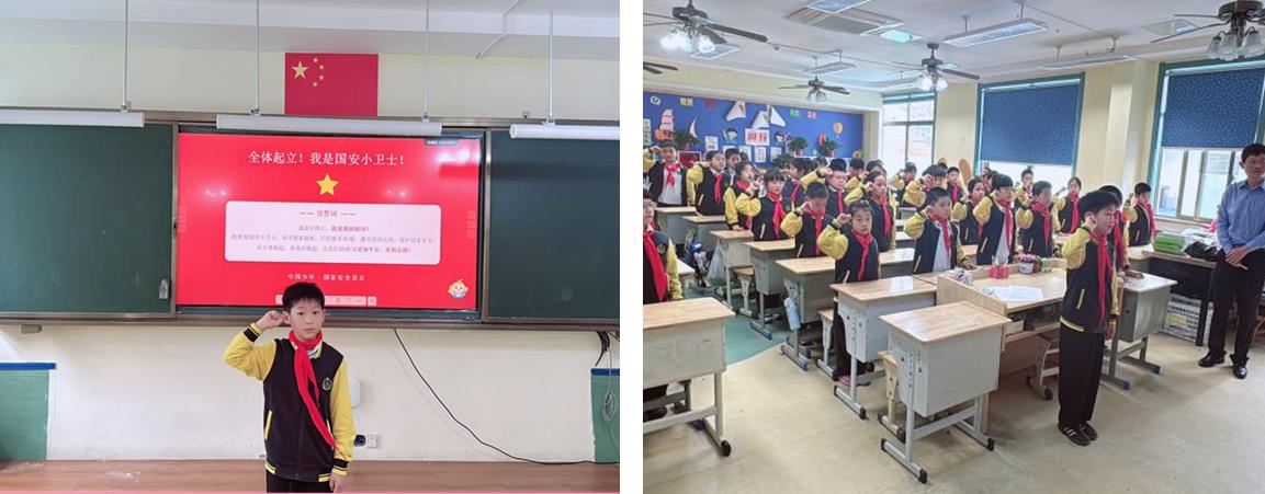 “我是中国人,我爱我的祖国!我要做国安小卫士……”在庄严的宣誓环节,伴随着《我和我的祖国》纯音乐,全体学生起立,高举右拳,大声宣读国安小卫士誓言,铿锵有力的誓言回荡在教室中,彰显着孩子们守护国家安全的坚定决心。