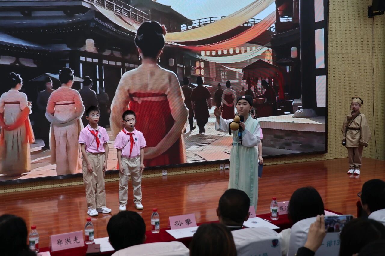 活动在沉浸式的艺术表达中拉开序幕。学生以英文歌曲Viva La Vida、Something Just Like This开启现场,在音乐与语言的自然交融中,营造出开放而富有张力的学习氛围;英语戏剧One Day in Chang’an – A Thousand Years’ Echo(《长安一日·回响千年》)以跨越时空的叙事方式,生动再现长安盛世,在语言表达与文化意象的交织中,向与会嘉宾呈现出富有感染力的学习场域。 湖居笔记小学屈冬宁校长在活动中系统介绍了该校英语浸入式教学在课程建构、课堂转型与学生发展中的探索路径与阶段性成果。