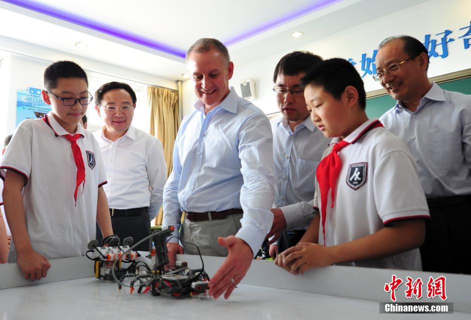 5月25日,魏杰与学生一起玩“机器人”。当日,澳大利亚南澳州州长魏杰在济南参观访问山东师范大学附属小学,听学生唱演中华传统文化经典“三字经”。中新社发 张勇 摄