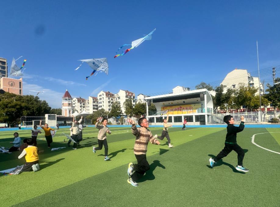 当风筝制作完成,同学们迫不及待地来到操场。瞧!他们手中紧握着自己的“得意之作”,迎着风奔跑起来,欢声笑语回荡在操场上空。不一会儿,一只只风筝便扶摇直上,稳稳地翱翔在蓝天之中。孩子们玩得满头大汗,却依旧乐此不疲。