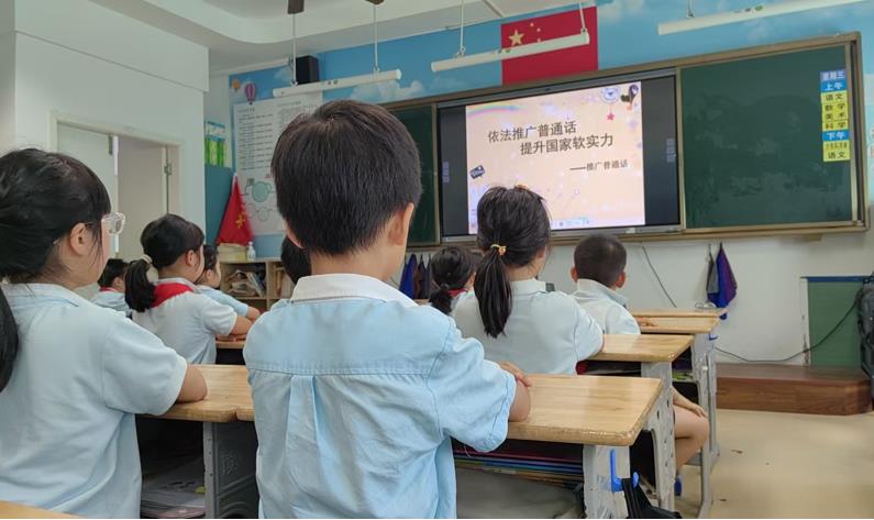 推普周期间,各班以“全员参与、趣味融入”为原则,让普通话学习“接地气、有温度”。多媒体教室成了“语言乐园”——学生观看普通话示范、方言与普通话对比视频,在笑声中感受语言魅力;教师用图文并茂的PPT,详解推普意义与方法。