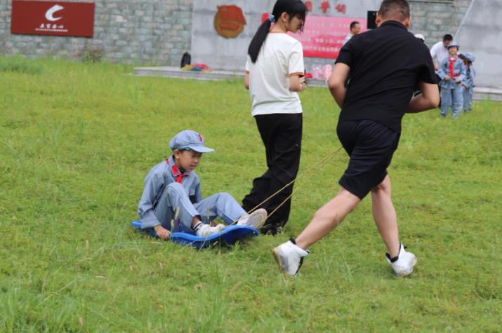 队员们分成五个小组,首先迎来的是模拟"过草地"挑战。队员们坐在划草板上,由家长们拖行穿越障碍区域。这个别开生面的设计既考验团队协作,又让队员们亲身体验红军长征的艰辛。不时有队员从板上翻落,但总是迅速爬起、重新出发,用实际行动诠释了不屈不挠的精神。这一刻,团结互助不再是抽象的概念,而是化为了实实在在的行动。