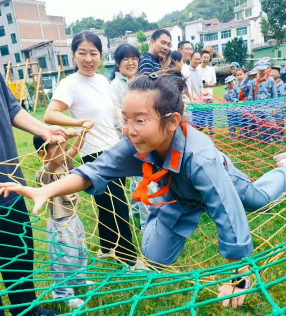 紧接着的"飞夺泸定桥"环节将活动推向高潮。由家长和网兜搭建的模拟铁索桥上,队员们需要依次攀爬通过。起初不少队员面露惧色,但在家人和队友们的鼓励声中,一个个鼓起勇气,手脚并用地向前迈进。当最后一名队员成功抵达终点时,整个山谷回荡着激动的欢呼声。这不仅是体能的挑战,更是勇气与意志的锤炼,这份战胜自我、超越极限的经历,必将成为队员们成长道路上宝贵的精神财富。