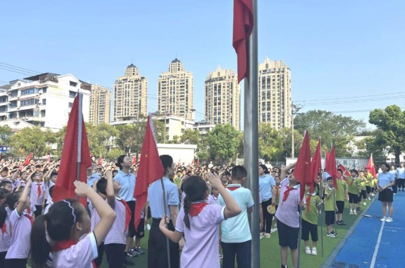 清晨的校园格外庄重,雄壮的《义勇军进行曲》准时响起。全体师生列队肃立在操场,目光紧紧追随冉冉升起的五星红旗,少先队员敬队礼,教师行注目礼,鲜红的旗帜在朝阳下迎风舒展,嘹亮的歌声回荡在校园每个角落,将“爱祖国、敬国旗”的信念深深印在每个人心中。