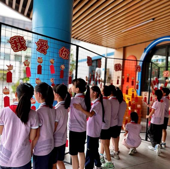 学校大厅里,一面“国庆祝福墙”温暖又醒目。红色的祈福牌、色彩斑斓的创意贺卡挂满墙面,每一张都写满西苑少年的赤子之心——“祝祖国妈妈生日快乐!”“愿祖国越来越强大!”“我要好好学习,长大后报效祖国!”这面充满童真的“祝福墙”成了校园里的“热门打卡地”,不仅装点了校园,更展现出新时代少年的责任与担当。
