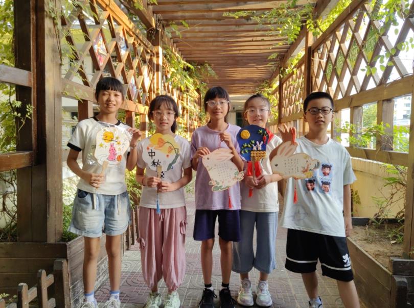 在“巧手绘中秋”环节,空白团扇成了挥洒创意的画布。同学们手执画笔,描绘出一个个独特的中秋故事:皎洁的明月高悬于缥缈云海,温馨的家人围坐共享团圆,还有灵动的玉兔、飘逸的嫦娥与芬芳的桂花点缀其间。每一把团扇都是一首无声的诗,承载着孩子们对传统佳节最纯真的理解与最美好的祝愿。