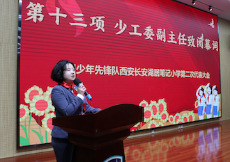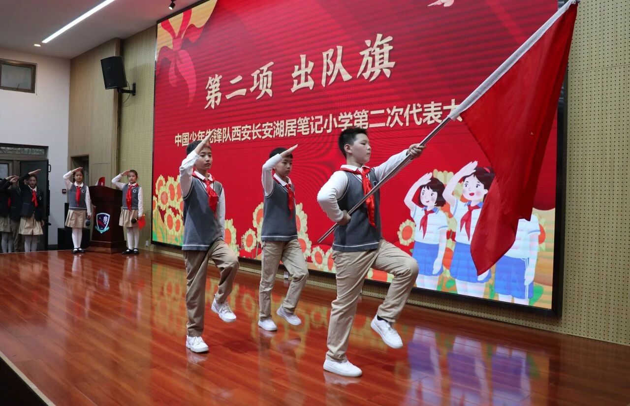 西安长安湖居笔记小学少先队员和全体少先队工作者,满怀着建队76周年的喜悦,集结在星星火炬的队旗下,隆重召开中国少年先锋队西安长安湖居笔记小学第二次少先队代表大会。