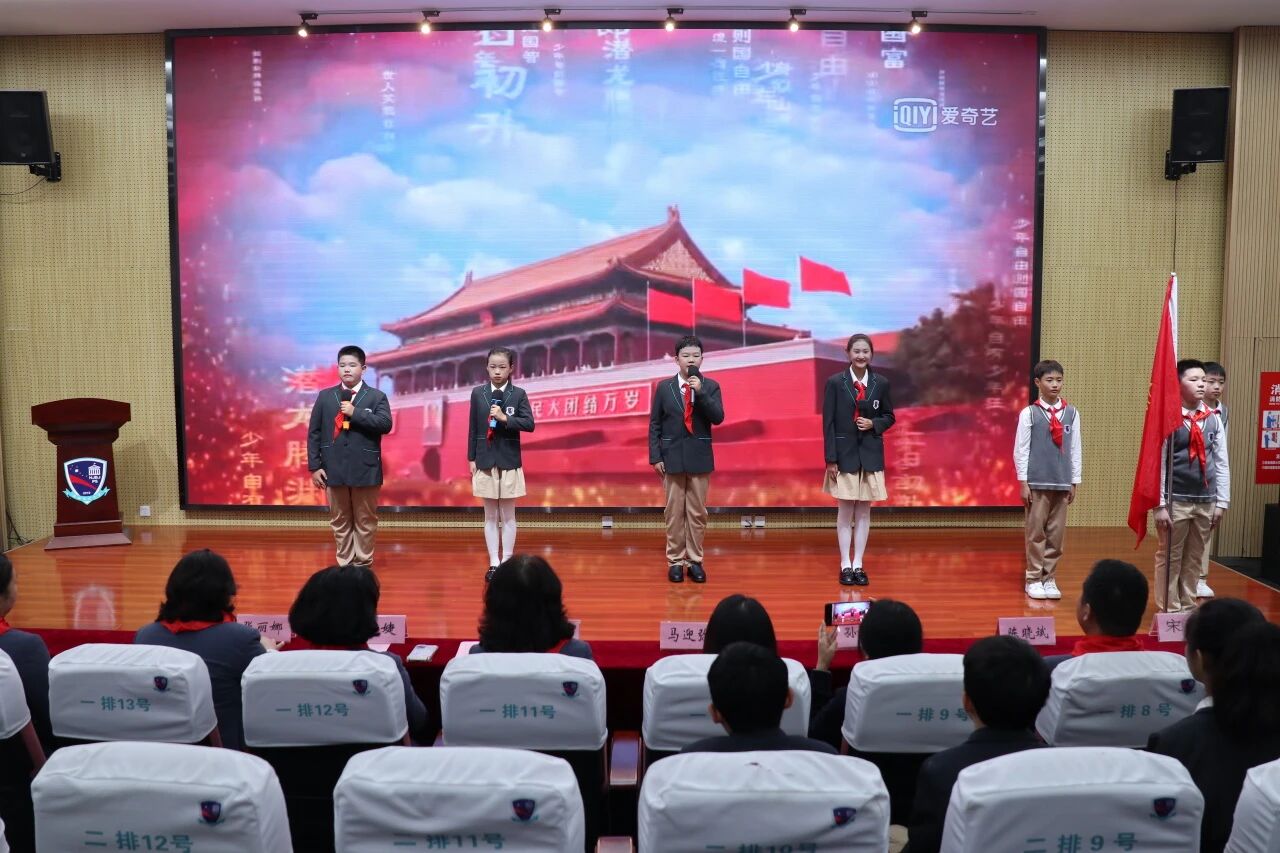 大会伊始,全体起立合唱中华人民共和国国歌。伴随着庄严的出旗曲,护旗手们迈着铿锵有力的步伐进入会场。全体少先队员高唱《中国少年先锋队队歌》,激情澎湃的歌声久久回荡,唱出了队员们心中崇高的理想。