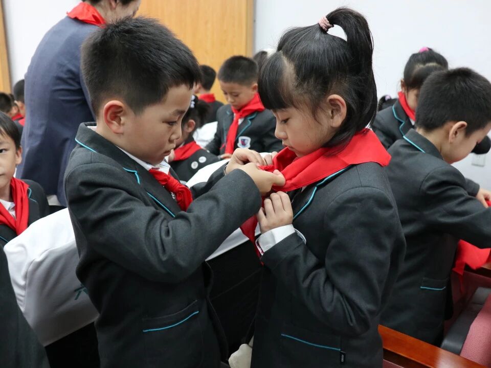 新队员入队仪式。 优秀少先队员代表们手捧一条条鲜艳的红领巾,为在场全体新队员佩戴红领巾,新老队员互敬队礼。星星火炬,代代相传,新老队员们的情感紧紧相连。