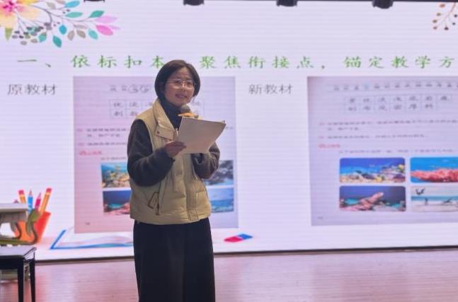 精彩的课堂展示后,三年级语文备课组长戴妙君老师代表全组成员与大家分享设计理念和磨课历程。戴老师从教材衔接、要素落地、能力阶梯三个维度进行解读。她指出,面对新教材的变动,团队在《富饶的西沙群岛》这一经典篇目中,特别注重生字学习和学法指导的平稳过渡。她强调,本节课的设计始终以“找关键句、圈关键词”为主线,通过“教—扶—放—练”的阶梯式设计,让学生思维得以生长,实现从“学会”到“会学”的跨越,最终达成语文核心素养的沉淀。