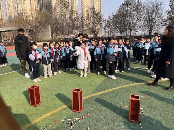 开幕式节目展演结束后,孩子们期待已久的“游园闯关”活动开始了!在带队老师的指引下,一二年级的学生通过“拼音糖葫芦”“汉字小达人”“长安小诗仙”“儿歌名篇接龙”游戏活动,传递着汉语的独特魅力和中华文化的精神风貌。在探索与体验中,共同感受“诗”的深邃,“语”的灵动!“投壶”“诗词接龙”“百步穿杨”“飞花令”,三四年级的同学的闯关活动实在精彩极了。五六年级同学的闯关项目有:“抽签诵诗”“古诗词对句”“九宫格组诗”“看图猜古诗”。