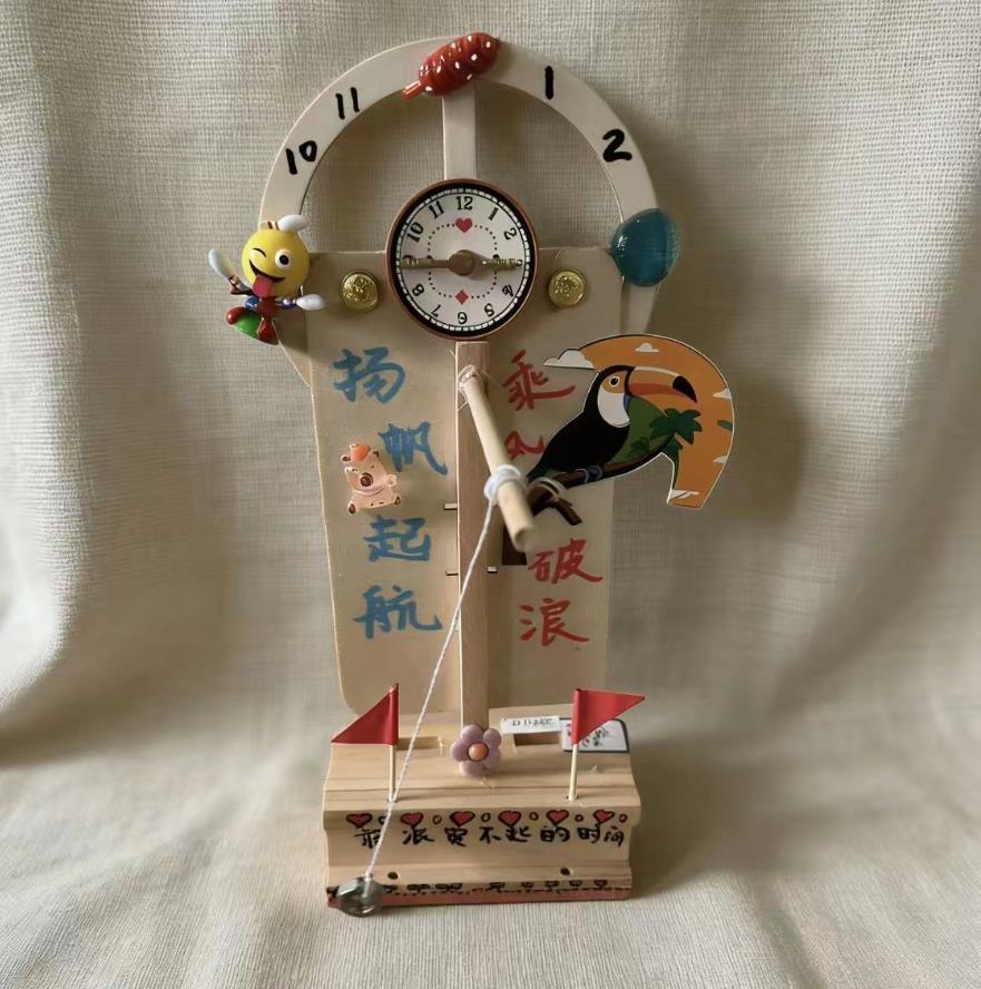 五年级的同学们化身小小“计时大师”,将科学原理探究与创新设计实践深度融合,在“创意控时间”的主题活动中锤炼严谨细致的科学态度。他们以小组为单位协同作战,充分发挥团队智慧,巧用矿泉水瓶、硬纸板、棉线、砝码、吸管等日常材料,自主设计制作各类计时工具——有精准控流的分层水漏,有稳定摆动的木质摆钟,有巧妙利用重力的沙钟,还有融入机械原理的齿轮计时装置等等,从最初的方案研讨、原理梳理,到材料甄选、动手制作,再到反复调试、误差修正,同学们在每一个环节都精益求精,面对计时不准、结构不稳等问题,不气馁、不急躁,通过查阅资料、小组会商、多次测试,一步步优化作品,全力向“精准计时”的目标迈进。