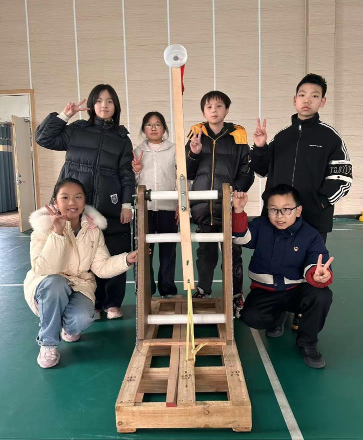 六年级的学长学姐们化身酷炫的“机械大师”,开启了一场以“精准投射,投石神机”为主题的科学实践盛宴。作为高年级特色活动,同学们以5人小组为单位并肩作战,在科学教师系统讲解杠杆原理的基础上,结合自主查阅的资料,开启了投石机的设计、制作与调试之旅。他们巧用PVC管、木板、绳索、轴承、废旧纸箱等材料,打造出一件件兼具科学性与创意性的投石机作品——有结构稳固的三角支架投石机,有可调节投射角度的折叠式投石机,有融入复古元素的木质投石机,还有加装精准瞄准装置的升级款投石机……从绘制设计草图、计算受力角度,到切割组装材料、固定传动结构,再到反复调整支点位置、测试投射距离与精准度,每一个环节都凝聚着团队的智慧与汗水。面对投射偏移、结构松动等问题,同学们沉着应对,通过小组研讨分析问题根源,不断优化设计方案,一次次调试改进,只为让“神机”精准命中目标。