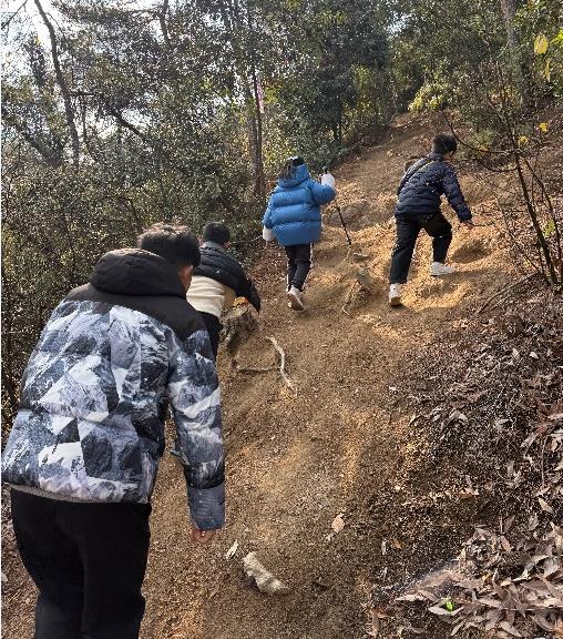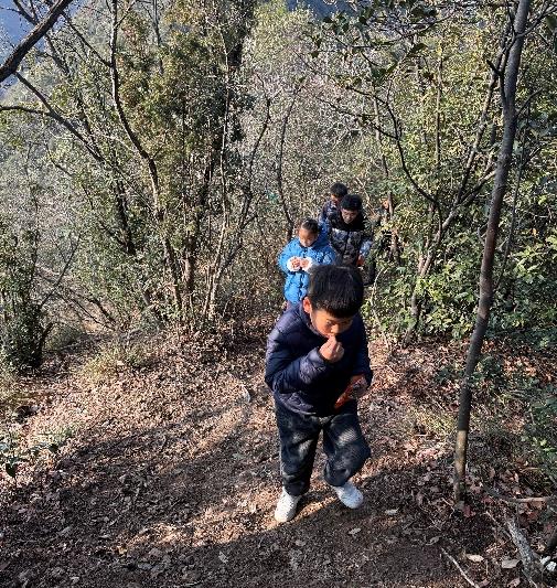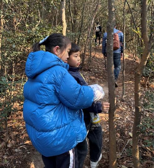 清晨的四顾屏草木凝霜,山路蜿蜒向上,带着冬日山野的清冽气息。小队成员们踏着轻快的脚步向上攀登,沿途的松柏、山间的鸟鸣让孩子们兴致盎然,吴怡霖不时停下脚步等候同伴,分享自己和妈妈徒步时观察到的自然小知识:“这种带刺的灌木冬天也不会落叶,特别坚韧呢!”