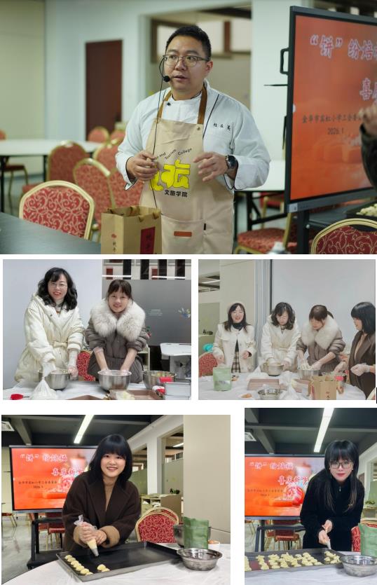 冬日的暖阳透过玻璃,与烤箱中弥漫的甜香轻柔交织。元旦欢庆之际,金华市宾虹小学的老师们暂别讲台,走进金华职业技术大学文旅学院的烘焙教室,系上围裙,在笑语盈盈中开启了一场温暖的手作之旅,用亲手制作的饼干庆祝2026年的到来。