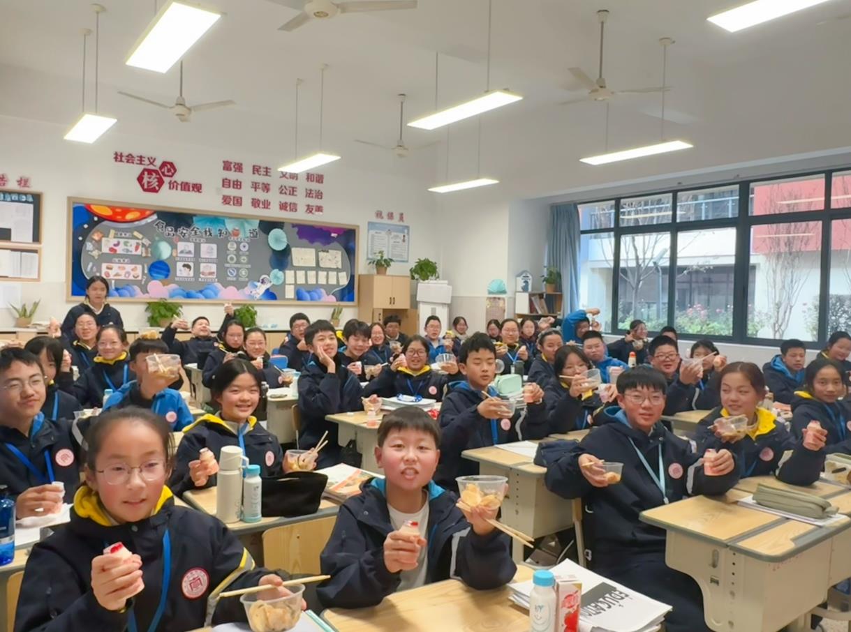 “这青菜也太甜了吧!”“这是我吃过最好吃的青菜炒年糕!”“明年我们种什么呢?”浙江省金华市南苑初级中学702班的教室里,传出阵阵讨论声。走近教室,原来是他们正在品尝自己亲手种的青菜。你看,同学们的碗里盛满了青菜炒年糕,他们一个个吃得津津有味,青菜的清香混合着年糕的软糯、香肠的咸香,弥漫在702教室。