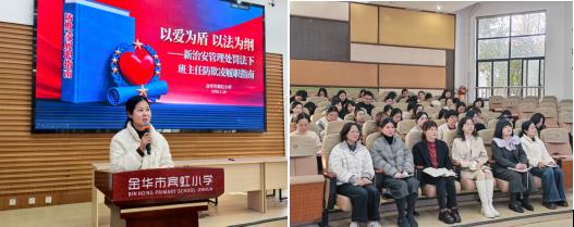 近年来,金华市宾虹小学持续加强德育与法治教育融合,逐步构建 “学校-年级-班级”三级防护机制,定期开展班主任法治培训,完善突发事件处理流程,并为班级管理提供法律与心理支持资源。