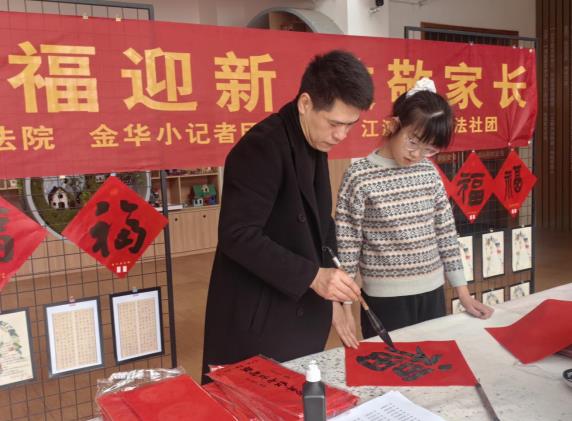 为了让更多师生与家长共享新春祝福,浙中书法院还精心准备了多项暖心福利:特制联合落款的名家“福”字两件套200份,供教职工分发与家长便捷领取;提前书写30幅精美门联,装点学校办公室等公共场所,让翰墨书香萦绕校园,处处洋溢新春气息。