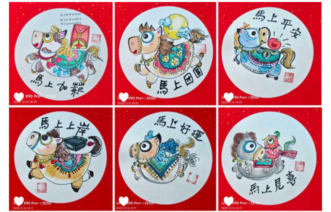 由他创作的马年系列绘画与文创产品,如手提袋、红包、香囊及窗花等,一经推出便广受青睐。这套作品以传统年画为蓝本,巧妙融合中国画的笔墨韵味,在保留传统年画精髓的基础上,大胆融入现代审美理念与艺术风格。通过马的形象及相关吉祥元素,传递出“马上有福”“马上平安”“马上如意”“马上有财”“马上好运”“马上开心”等美好祝愿,深刻表达了对生活繁荣、事业蒸蒸日上以及健康与财富的深切期盼。