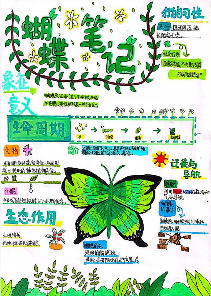 “我跟着科普小视频一点点学习,才知道昆虫冬天会躲在树皮缝、落叶下冬眠,太神奇啦!”三(1)班的王姝淇拿着自己的《蝴蝶笔记》,眼里满是欢喜。她的笔记里,一只翠绿的蝴蝶翩然跃于纸上,翅膀的纹路清晰可辨,旁边用工整的字迹详尽记录着蝴蝶“卵→幼虫→蛹→成虫”的完整蜕变历程,从生活习性到生态作用,每一处细节都细致入微,字里行间满是对生命的好奇与热爱。