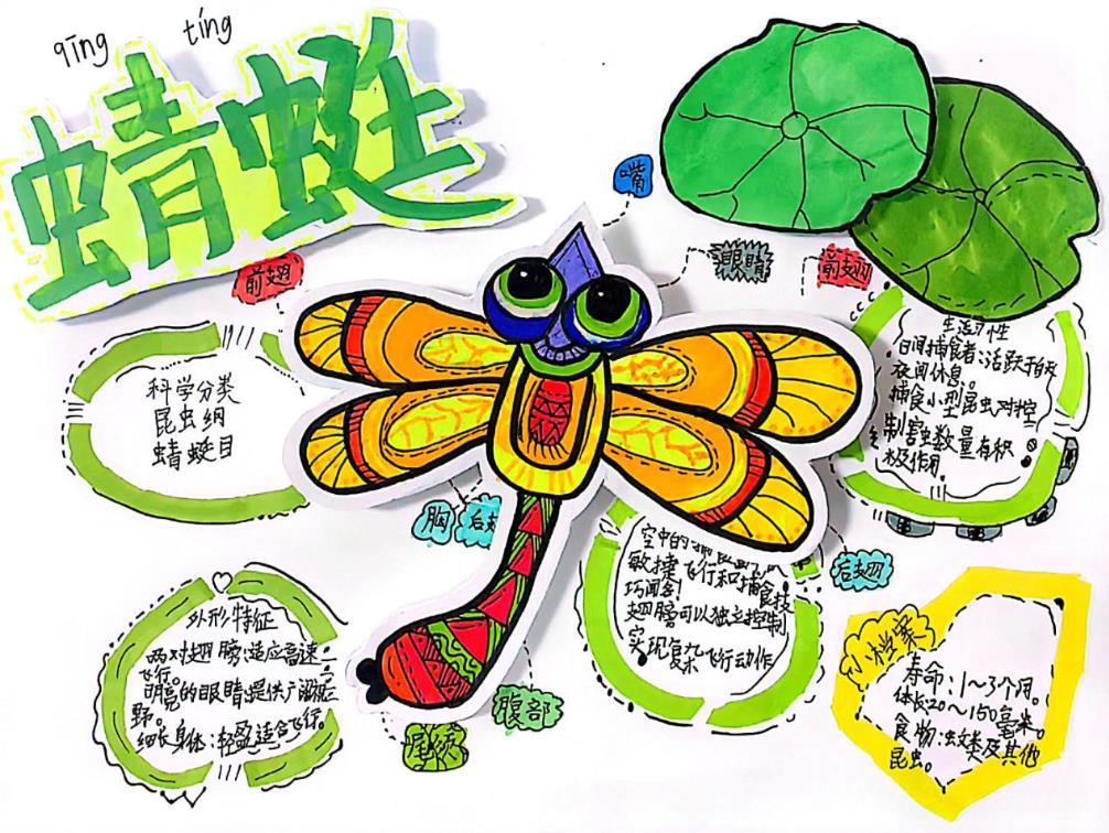 孩子们的创意更是藏不住——剪纸拼贴的“蜻蜓点水图”栩栩如生,翅膀的纹路用彩纸层层叠加,仿佛下一秒就要掠过水面;流程清晰的“蚕的一生”笔记,用简笔画一步步还原从蚕卵到飞蛾的蜕变,每一个阶段都标注着关键特点;还有精细勾勒的“螳螂结构图”,头部的复眼、前肢的锯齿都清晰可见,连触角的数量都标注得一丝不苟。一份份笔记虽带着孩童的稚嫩,却每一页都闪耀着认真思考的光芒,藏着对自然的敬畏与热爱。