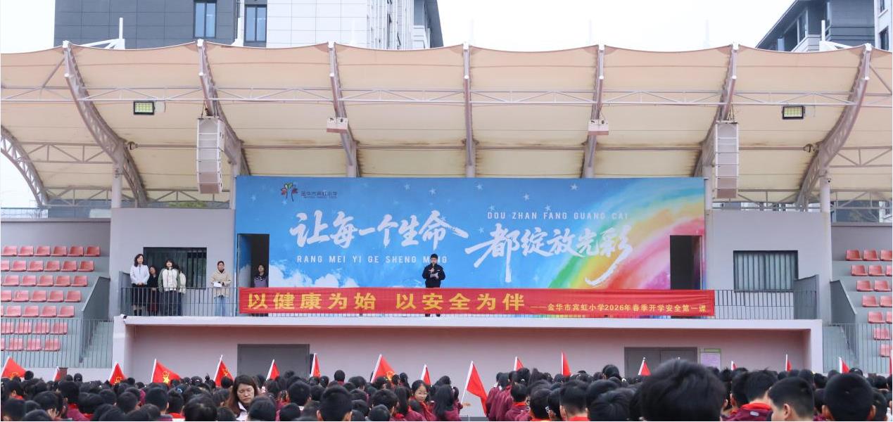 为深入落实《浙江省安全生产委员会办公室关于开展 2026 年安全生产 “开工第一课”“开学第一课” 的通知》要求,紧扣教育部 2026 新春第一会锚定的 “健康第一” 工作要求,切实筑牢校园安全防护网,让安全理念入脑入心、应急本领落地落实,金华市宾虹小学以春季开学为契机,开展开学安全第一课和应急演练活动,法治副校长王俊朝倾情授课,保安公司倪建佳、徐维刚教官全程指导演练,用学生喜闻乐见的形式普及安全知识,将 “健康第一” 融入校园安全工作各环节,为全校师生的新学期校园生活保驾护航,守护每一个 “宾宾虹虹” 的成长。