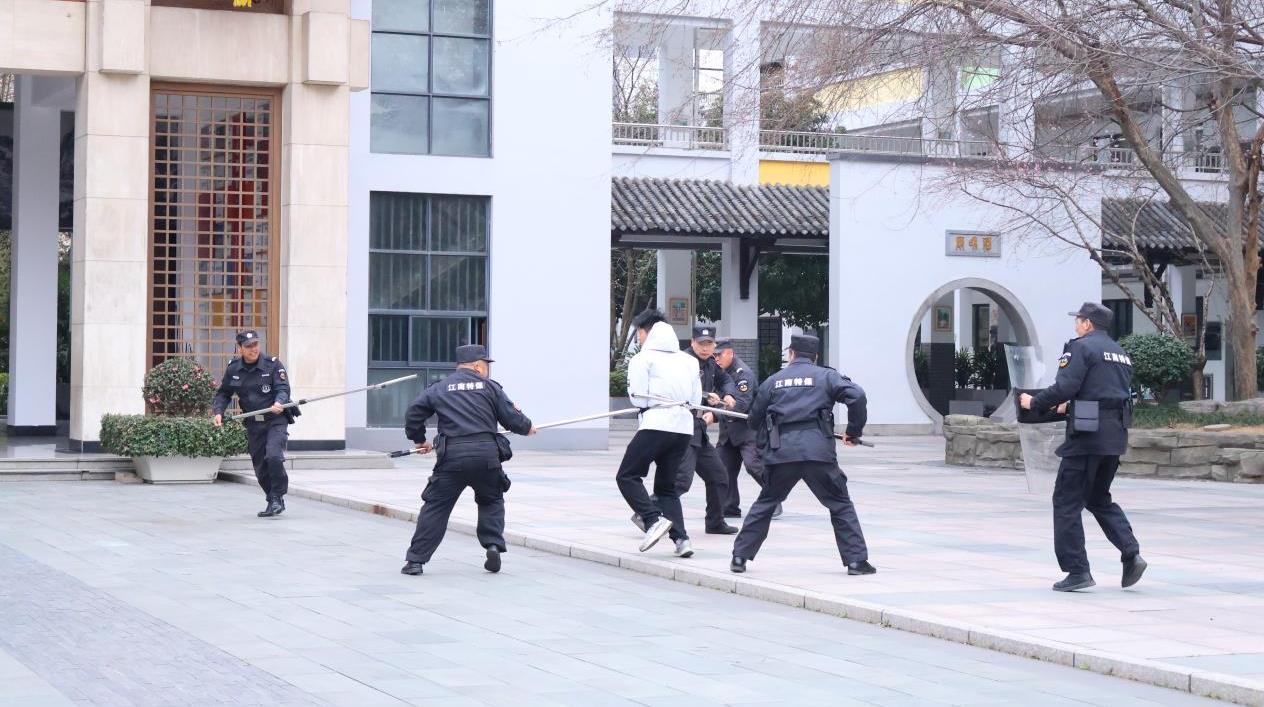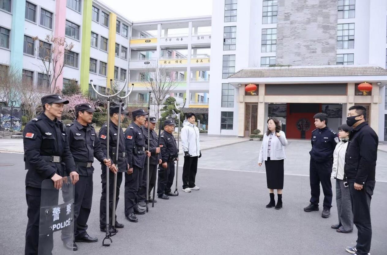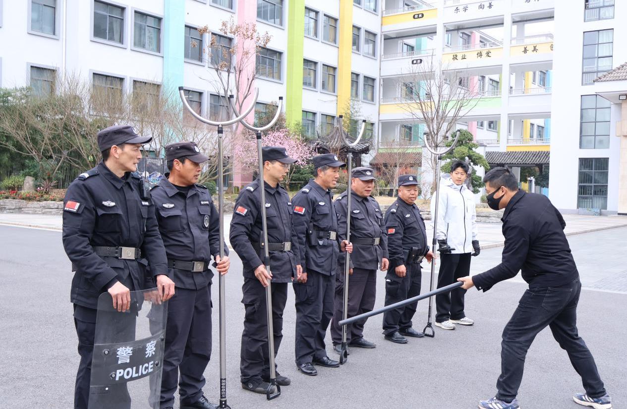 演练前,校领导联合保安公司教官制定详细预案,明确各岗位职责,讲解演练流程与处置要点;演练中,模拟不明身份人员企图强行闯入校园的突发场景,校门口安保人员第一时间发现险情,迅速按下一键式报警器报警,同步上报校领导,手持防暴钢叉、盾牌等器械上前拦截管控。学校应急小组与安保人员紧密配合,形成联防联控处置体系,整个演练过程紧张有序、衔接顺畅,精准还原了校园突发险情的真实处置流程。