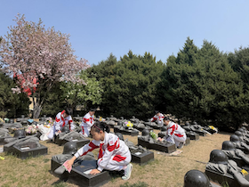 走进八宝山革命公墓的烈士陵园和红旗广场,我们学习了红军长征的故事,那些爬雪山、过草地的艰难历程,让我们心里又感动又敬佩。我们纷纷拿起抹布打扫擦拭,为英烈献花,寄托追思。今年是红军长征胜利90周年,我和同学们特意自创了诗歌《跨越时空追寻红色长征路》,大家用朗诵、宣讲的方式,把对长征英雄的怀念说出来,也暗暗下定决心,要继承长征精神,做有理想、有担当的新时代好少年。