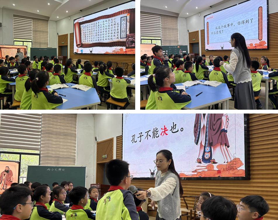 黄老师的课堂以“辩”为核心,通过层层递进的任务带着学生一步步提升思维。从“辩”字字理切入,一下子激发了大家的好奇心,“读辩斗故事”时,通过分层朗读和填表格,帮学生从读懂句子,慢慢学会理清辩论的逻辑,在“探辩斗智慧”环节,学生小组讨论后发现,两小儿分别从视觉和触觉来论证,慢慢学会了多角度看问题。“展辩斗风采”让学生上台演一演,边辩边想,语言表达和思维能力一起得到了锻炼。最后围绕孔子“不能决”展开思辨,还结合科学知识,让学生真正读懂了故事背后的道理。整堂课一环扣一环,学生越学越深入,思维的火花在每一个环节悄然绽放。