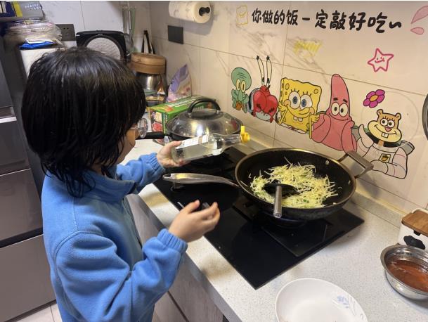 金华市江滨小学三6班的夏梓菡小朋友最拿手的一道菜就是醋溜土豆丝。由于年纪小,还不太会用菜刀,平时都是爸爸的指导下,用刨丝器将土豆刨丝,再将土豆丝反复清洗,洗去土豆的淀粉。油热,下锅,翻炒,加醋,一道美味的醋溜土豆丝就完成了。