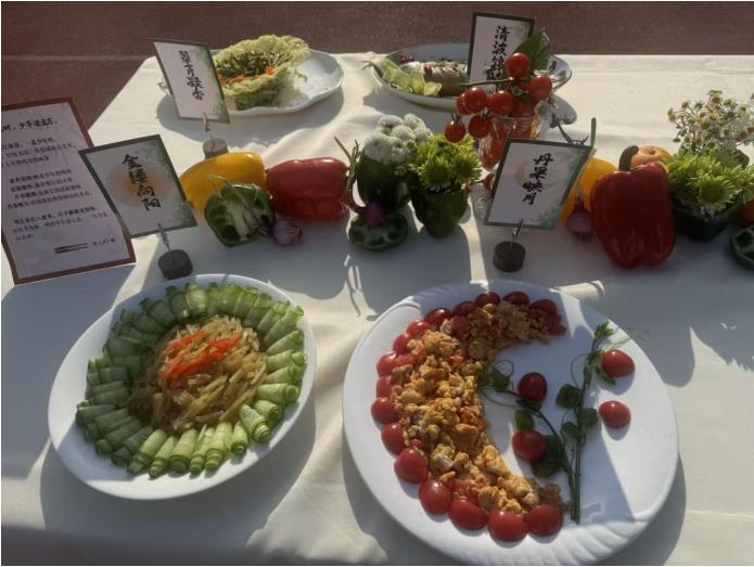 而在校园劳动成果展示现场,同学们更是将劳动与创意完美融合。一张张餐桌上,摆满了同学们精心制作的美食与创意摆盘:造型精致的手工饺子整齐排列,寓意团圆美满;色彩丰富的果蔬拼盘巧思满满,“一马当先”“丹果映月”等创意命名,让普通食材变身艺术品;清爽的凉拌菜、精致的热炒菜,每一道都色香味俱全。同学们不仅用双手烹制出美味佳肴,更用创意赋予美食文化内涵,将劳动技能与审美素养、文化底蕴相结合,充分展现了新时代青少年的综合素养。