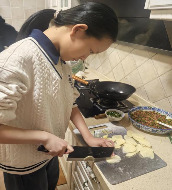 “哒哒哒……”“滋滋滋……”锅碗瓢盆演绎出一首动听的交响乐,周末,同学们化身“小小厨师”,沉浸式体验烹饪的完整流程。菜板上,将土豆等食材切成厚薄均匀的薄片,刀工在反复练习中日渐娴熟;灶台之上,油热、煎鱼、放配料,美味的红烧鲫鱼出锅啦;和面、擀皮、调馅,一个个精美的饺子呈现在案板上。每一个步骤都倾注了同学们的用心,在烟火气中体会到了“一粥一饭,当思来处不易”的深意。