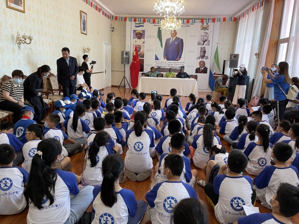小记者们走进了塞拉利昂共和国驻华大使馆。塞拉利昂共和国驻华大使馆公使衔参赞尤尼萨·卡拉马、塞拉利昂共和国一等秘书、驻华大使馆管理负责人爱莎、驻华记者等人对新华小记者的到来表示了热烈欢迎。